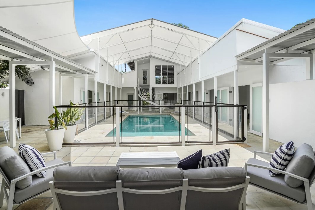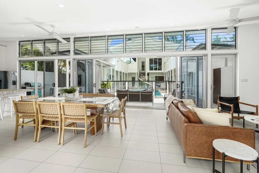 Centered around a stunning central swimming pool and elegant paved patio, the modern layout effortlessly blends indoor and outdoor spaces. Enjoy multiple areas to dine, unwind, and relax with your family during your beachside holiday.